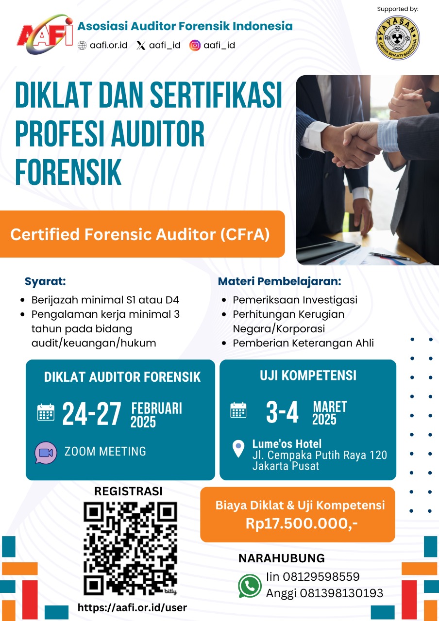 Asosiasi Auditor Forensik Indonesia Yuneri (AAFI YUNERI), dengan dukungan dari Yayasan Cakra Bhakti Santosha, kembali mengadakan Diklat dan Sertifikasi Profesi Auditor Forensik dengan gelar Certified Forensic Auditor (CFrA). Program ini bertujuan untuk meningkatkan kompetensi para auditor dalam bidang audit investigatif dan forensik guna mendukung upaya pemberantasan tindak pidana keuangan dan korupsi.