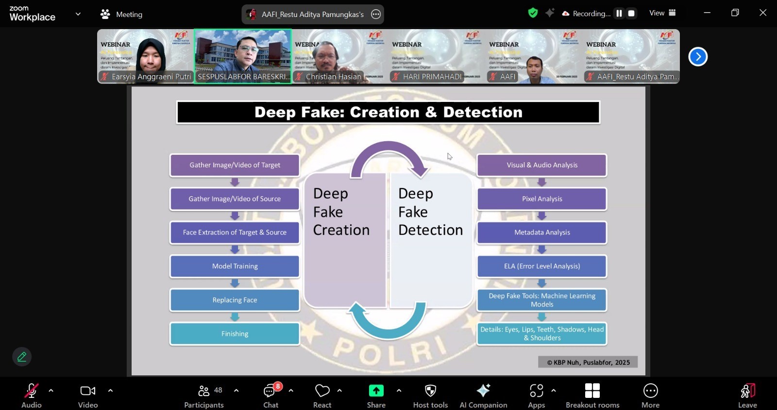 Webinar ini diikuti oleh 48 peserta dari berbagai institusi, termasuk lembaga pemerintahan, perusahaan swasta, dan akademisi. Diharapkan, setelah mengikuti webinar ini, peserta dapat lebih memahami perkembangan AI dalam dunia forensik, mengidentifikasi potensi risiko dari penggunaannya, serta menerapkan strategi yang tepat dalam menghadapi tantangan investigasi digital berbasis AI.