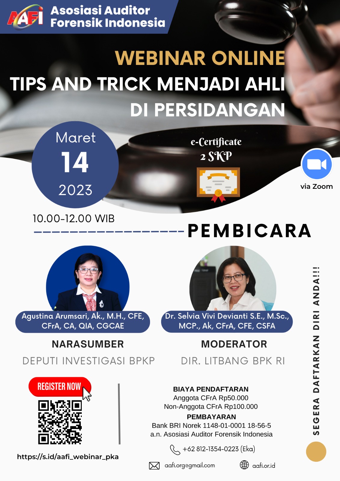 Asosiasi Forensik Auditor Indonesia (AAFI YUNERI) mengundang Bapak/Ibu dalam Webinar Online dengan Tema "TIPS AND TRICKS MENJADI AHLI DI PERSIDANGAN"