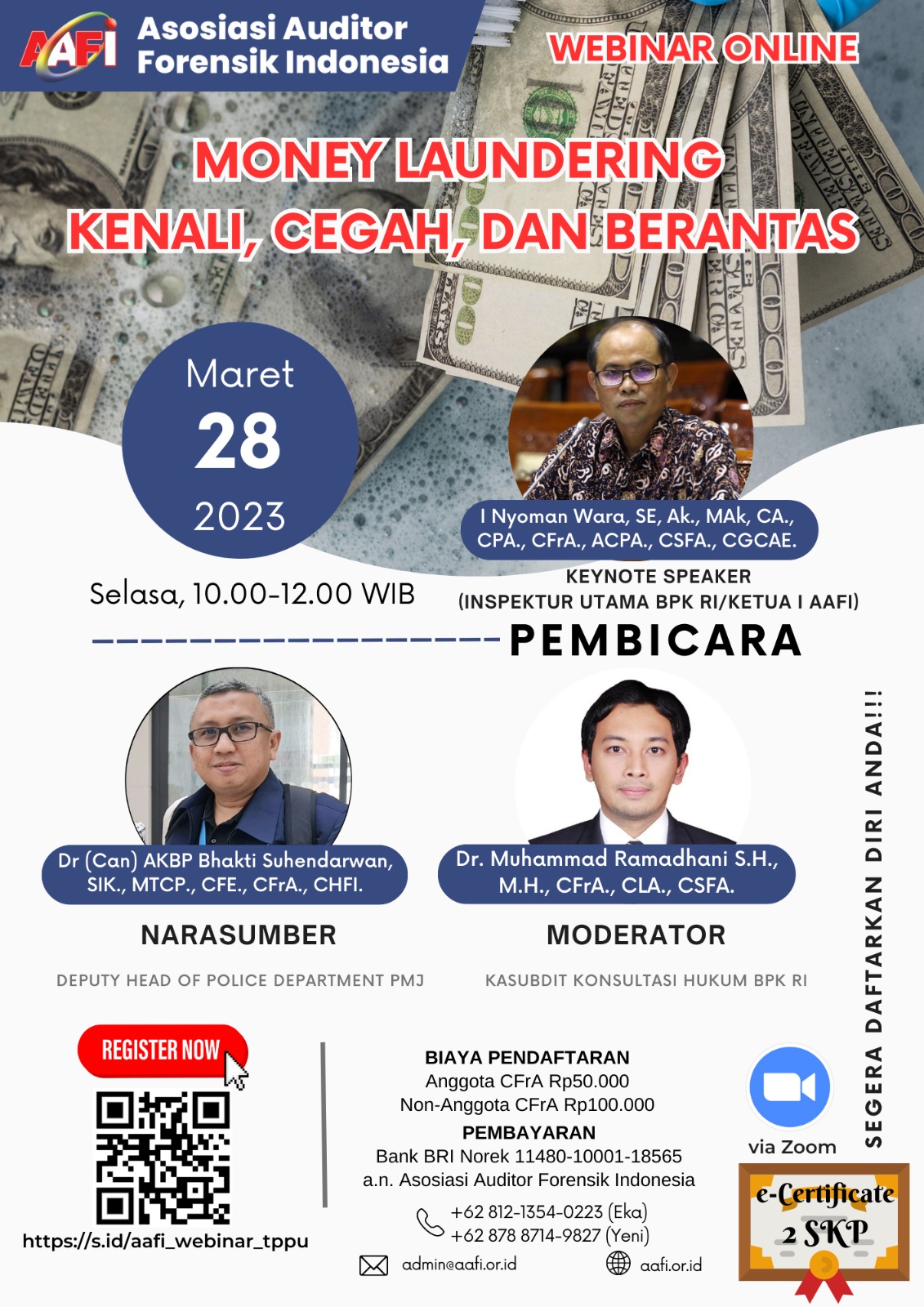 Asosiasi Forensik Auditor Indonesia (AAFI YUNERI) mengundang Bapak/Ibu dalam Webinar Online dengan Tema MONEY LAUNDERING, KENALI, CEGAH, DAN BERANTAS